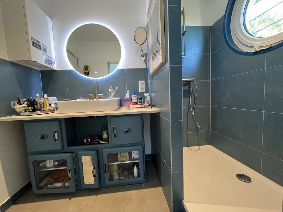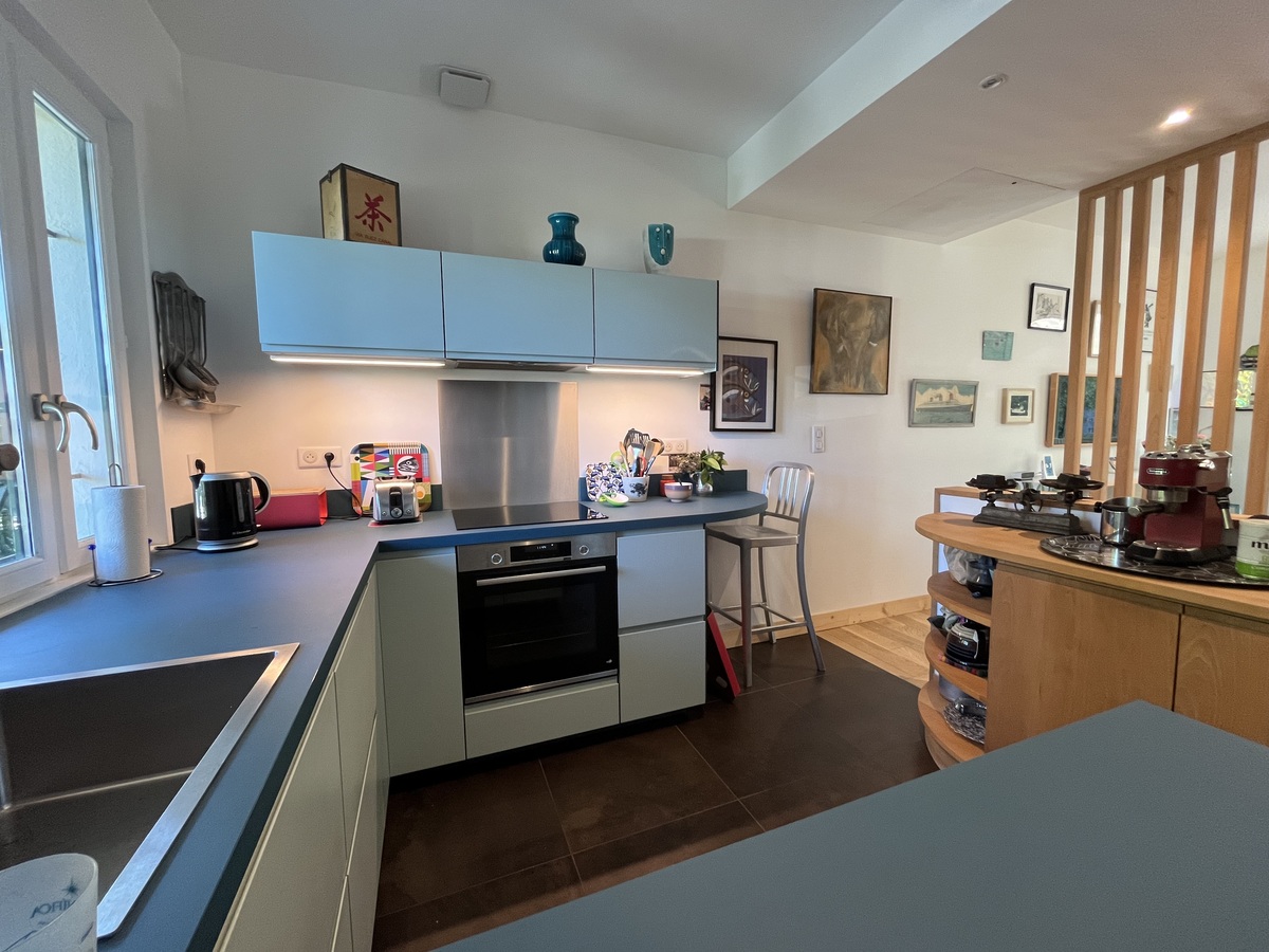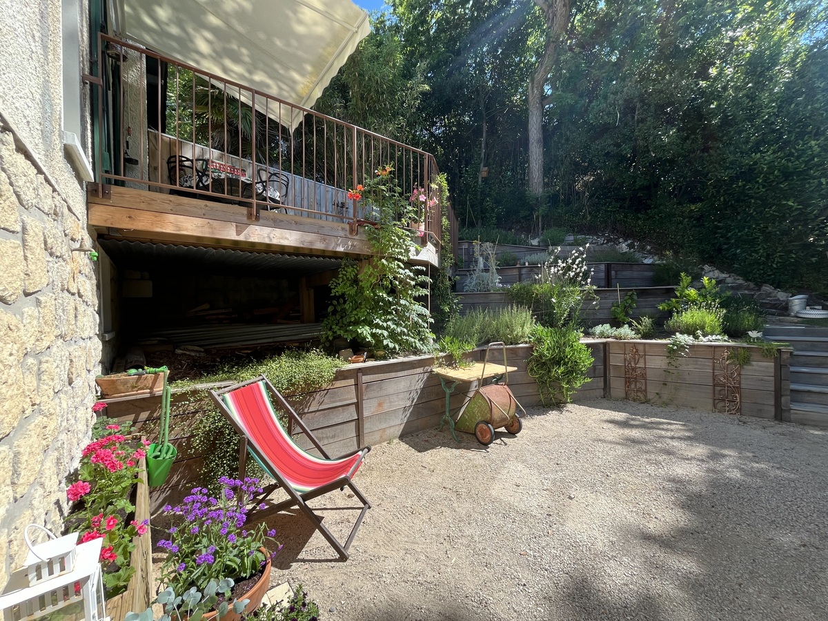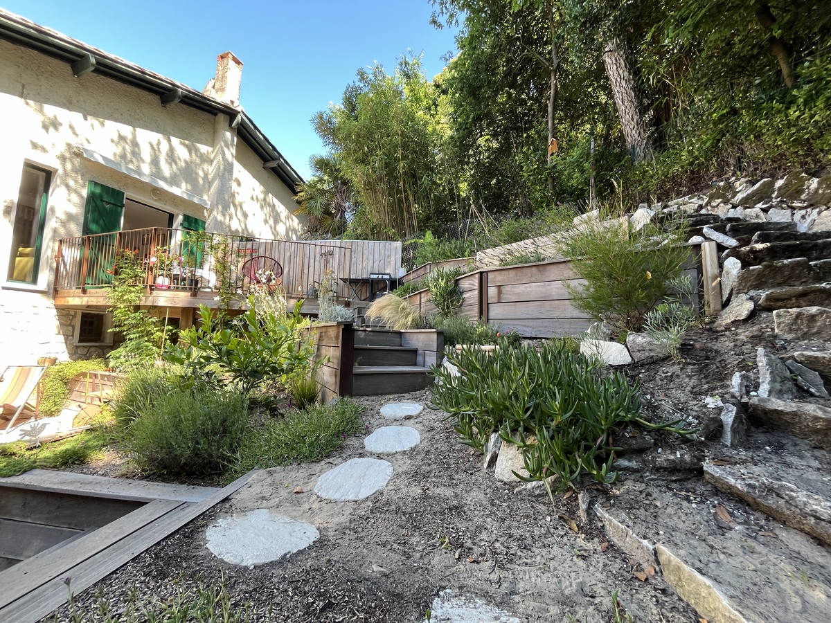 - en rdc surélevé, une entrée, cuisine équipée ouvrant sur un double séjour. De grandes fenêtres et porte fenêtre confèrent une belle luminosité à ces pièces et vous permettent un accès direct à la terrasse et au jardin savamment paysagé. Un chambre avec salle d'eau et wc viennent compléter ce niveau.